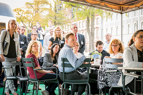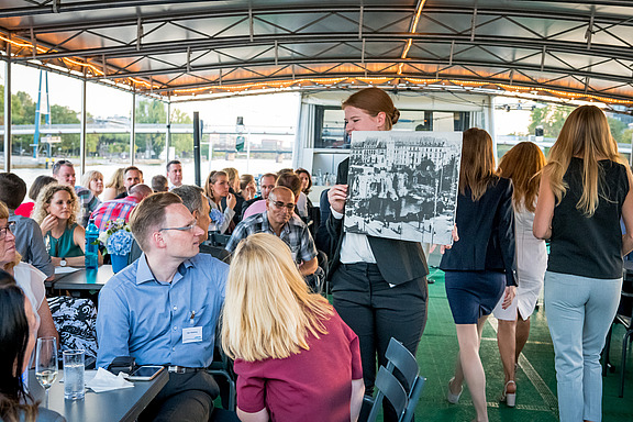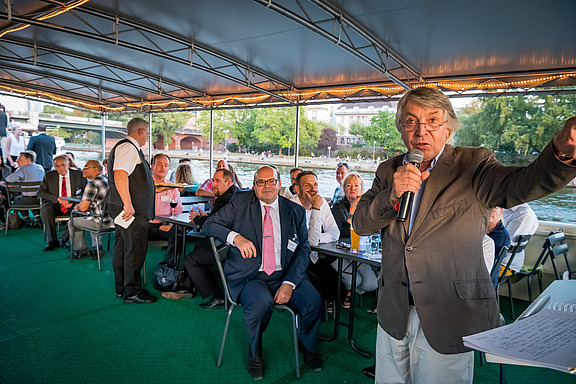 Es war ein Traumwetter – vermutlich einer der letzten wunderschönen warmen Sommerabende in diesem Jahr. Besser konnte es für eine abendliche Schifffahrt gar nicht sein.Die Gäste konnten es sich auf Deck in einer Lounge bequem machen. Wer Lust hatte, verfolgte den Vortrag von Dr. Peter Schirmbeck, der alte und neue Bauwerke entlang der Fahrstrecke erklärte.