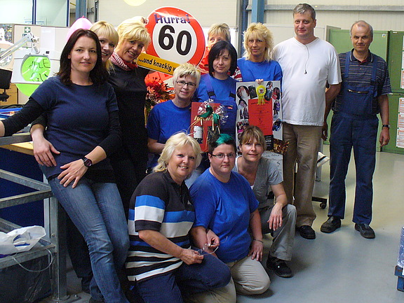 Juni 12 - Zu ihrem 60. Geburtstag gratulierte das Hofmann-Team der Niederlassung Chemnitz seiner langjährigen Mitarbeiterin Brigitte Seyrich recht herzlich, und überreichte ihr durch Disponent Horst Mehner eine kleine Aufmerksamkeit am Arbeitsplatz. In der Kundenfirma angekommen, staunte dieser nicht schlecht. Er war nicht der einzige Gratulant! Der gesamte Arbeitsplatz von Brigitte Seyrich war bereits mit bunten Ballons, Blumen und Geschenken geschmückt. Sie selbst war überwältigt und freute sich sichtlich über die kleinen Aufmerksamkeiten. „Wir schätzen sie als langjährige und zuverlässige Mitarbeiterin, die ihre Aufgaben mit großer Begeisterung erfüllt. Darum wollte ich es mir nicht nehmen lassen, Frau Seyrich zu ihrem 60. Geburtstag persönlich zu gratulieren“, sagt Horst Mehner.