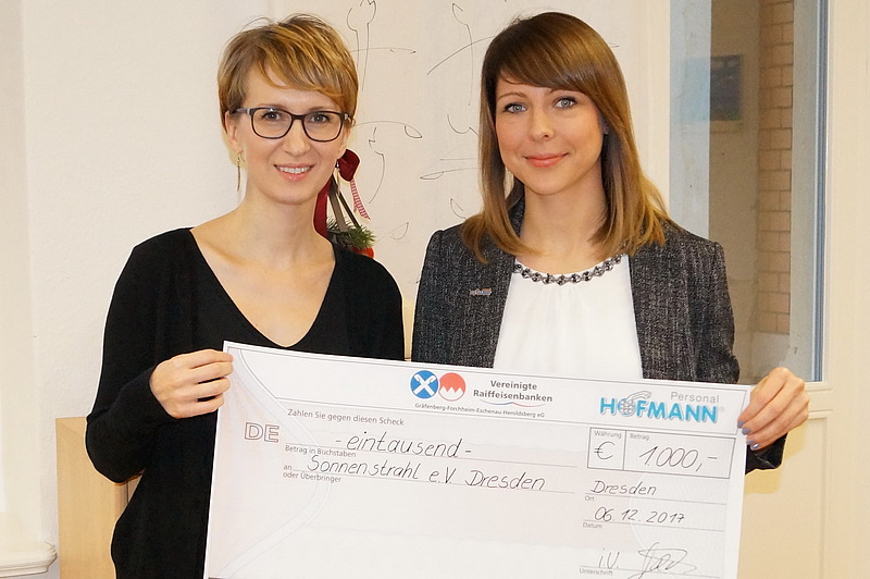 Am Nikolaustag schaute Hofmann-Mitarbeiterin Jenny Backasch beim Verein Sonnenstrahl vorbei und übergab einen Spendenscheck über 1000 Euro an Annegret Riemer. Mit großer Freude wurde dieser entgegen genommen und mehr oder weniger auch gleich verplant. Denn momentan werden im Elternhaus zwei weitere Zimmer eingerichtet, damit Eltern dort übernachten und ihren Kindern während der Chemotherapie oder nach einer Operation beistehen können. „Somit kommt unsere Spenden gerade zum richtigen Zeitpunkt“, freut sich Jenny Backasch.