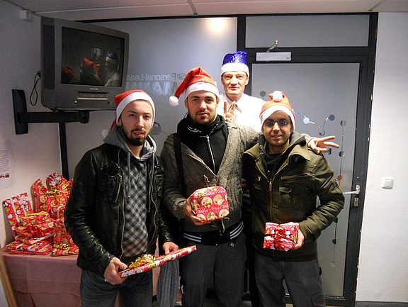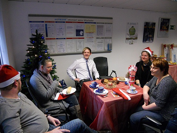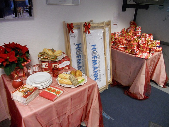 Dezember 12 –Auch dieses Jahrwaren die Mitarbeiter zu einer Weihnachtsfeier eingeladen. Die Niederlassung war nicht mehr wieder zu erkennen - ein nett geschmückter Tannenbaum, Gebäck stand zum Essen auf dem Tisch bereit und Weihnachtsgeschenke warteten auf ihre neuen Besitzer.