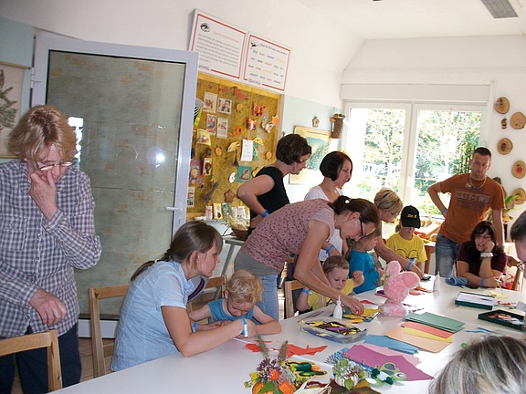 Die Vorschulkinder ließen sich von der Führung im Schmetterlingshaus verzaubern und bekamen als Dankeschön das Versteck von Leguan "Eddi" gezeigt. Ein Puppenspieler lud zur Aufführung „Hase und Igel“ in die Empfangshalle ein, während die älteren Kinder zum Grünen Klassenzimmer aufbrachen. Dort wurden die Gäste mit einer Bastelstraße im Freien begrüßt. Unter professioneller Anleitung wurden Kürbisse aufgeschnitten, ausgehöhlt, mit Blumensteckmasse versehen und nach Lust und Laune mit Gräsern, Blüten und Blättern der Saison zu einer farbenfrohen Dekoration gesteckt.