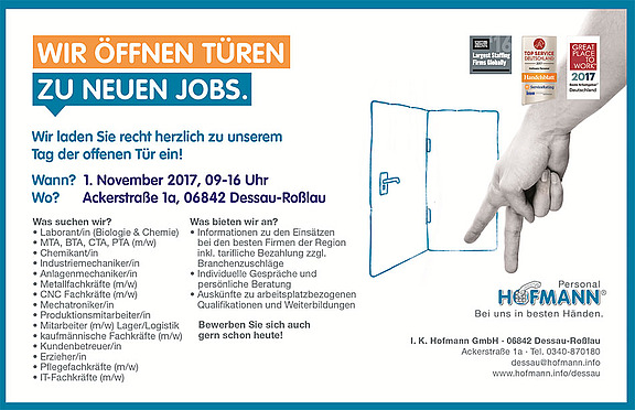 Okt. 17 – „Wir haben tolle Jobangebote in namhaften Firmen und laden jeden Interessierten herzlich ein, bei uns vorbeizuschauen und sich zu informieren. Vielen ist leider gar nicht bekannt, welche Chancen sich auf diese Weise bieten können, egal ob in der Produktion oder im kaufmännischen Bereich“, erklärt Niederlassungsleiterin Cornelia Schröter.
