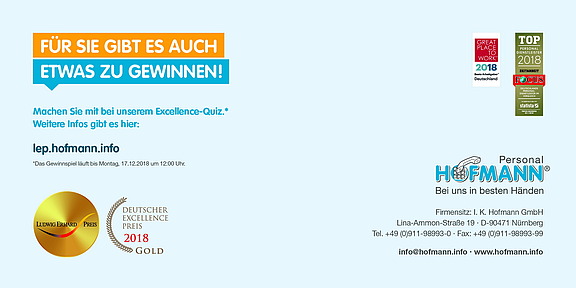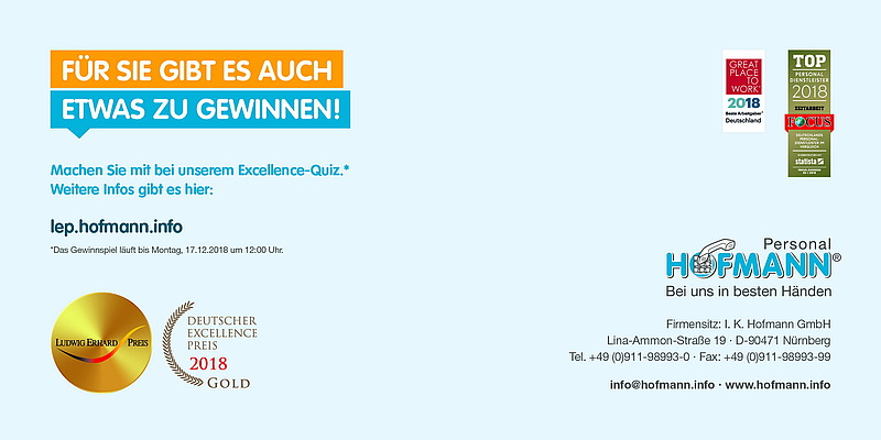 Sie können bis Montag 17.12.2018, 12 Uhr an dem Quiz teilnehmen: https://lep.hofmann.info/quiz/