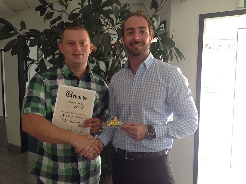 2014 - Seit fünf Jahren sind Kossi Tche Djoua, Marcin Gasch, Albert Kron, Damian Talik und Dagmar Oehmichen bei uns im Unternehmen. Alle fünf sind einfach ungeheuer sympathisch und es macht Spaß, gemeinsam mit ihnen zu arbeiten. Darum freut sich Personaldisponent Christoph Kagerer auf eine gute Zusammenarbeit für weitere fünf Jahre – gerne auch mehr.