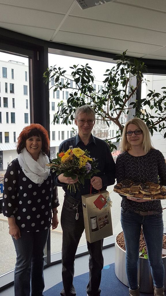 April/Mai 2016 – Carsten Fleischer ist seit über sechs Jahren bei Hofmann Personal angestellt. Anlässlich seines 50. Geburtstages schaute er in der Niederlassung vorbei und lud zu Kaffee und Kuchen ein.